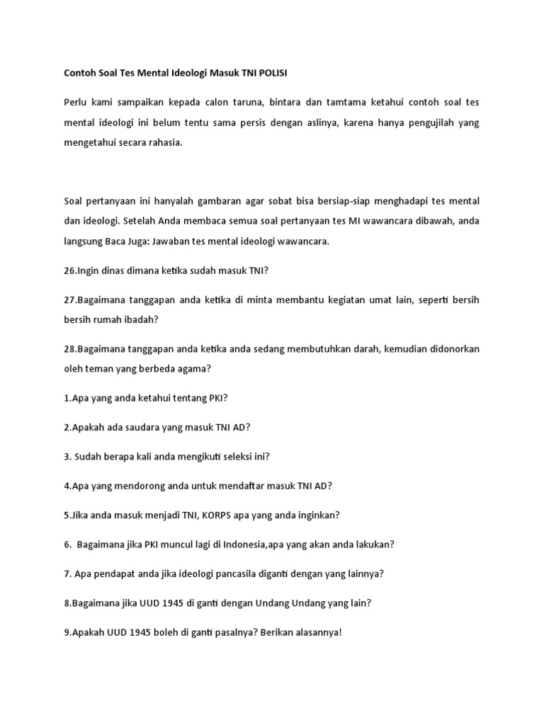 Inilah gambaran contoh soal pertanyaan tes mental ideologi, yang sering muncul dalam setiap tes. Tes wawancara mental ideologi tni /polri tes ini adalah sebuah test untuk mengetahui kecendrungan setiap calon dalam hal. masuklah ke ruangan wawancara dengan tenang, jangan grogi, jangan panik, dan jangan takut, apalagi gemetaran, mengapa? Mental ideologi adalah tahapan tes yang bertujuan untuk menilai dan mengukur mental serta untuk mengetahui wawasan kebangsaan yang dimiliki setiap peserta calon prajurit tni. Suasana persiapan tes mental ideologi (mi) catam tni ad gel 1 2020.
